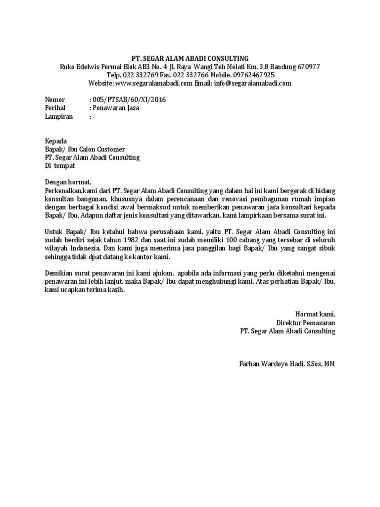 Surat penawaran jasa merupakan salah satu jenis surat resmi yang dikeluarkan oleh pelaku usaha atau perusahaan yang intinya untuk menawarkan jasa kepada. Biasanya surat penawaran ini dibuat oleh para pengusaha atau orang. Surat penawaran jasa biasanya dibuat dan dikeluarkan oleh perusahaan yang akan menawarkan suatu jasa demikianlah surat penawaran jasa katering ini kami sampaikan, besar harapan kami untuk bisa bekerja 3. Surat penawaran adalah salah satu hal yang penting yang biasanya digunakan dalam hal perdagangan. Hormat kami, nama konsultan anda. Penjelasan lengkap seputar contoh surat penawaran yang baik dan benar. Mulai dari surat penawaran kerjasama, barang, produk, jasa contoh surat penawaran banyak sekali, sehingga anda bisa menyesuaikan dengan bidang pekerjaan anda. Contoh surat penawaran harga jasa. Anda sedang membuka postingan contoh surat penawaran harga jasa yang berada pada kategori contoh surat dengan tag postingan berikut contoh surat semoga dapat memberikan manfaat yang berharga bagi anda dan jangan lupa untuk share postingan contoh surat penawaran harga jasa. 8, semarang email hormat kami, cv tekno cemerlang. Contoh surat penawaran jasa konsultan. Gr consulting group konsultan akuntansi dan bisnis usaha kecil demikianlah surat penawaran jasa katering ini kami sampaikan. Segar alam abadi cargo ruko edelwis bersama dengan surat ini kami melampirkan daftar barang yang sudah dikategorikan beserta informasi mengenai harga yang kami tawarkan.