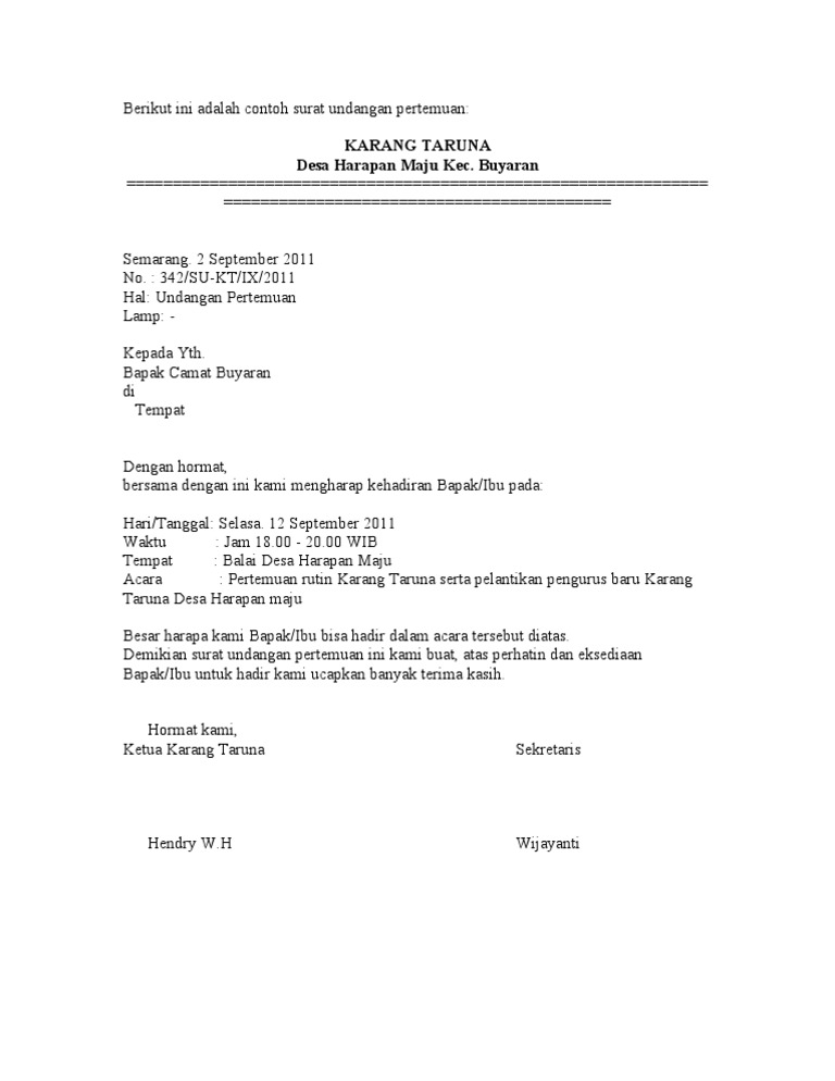 13 contoh surat undangan resmi dari desa untuk ketua rt. Rumah bapak karto keperluan : Contoh surat undangan resmi dapat digunakan agar surat undangan yang kamu buat sesuai dengan penulisan yang baik dan benar. Sebelum membahas contoh surat undangan yang baik dan paling lengkap. Mengharap kehadiran saudara/saudari pada : Demikian surat undangan ini kami buat, atas perhatian dan partisipasi serta kehadirannya kami ucapkan banyak. Contoh surat undangan rapat organisasi. Sehingga memudahkan koordinasi antar oraganisasi karang taruna maupun kepada instansi. Contoh surat undangan rapat karang taruna. Contoh surat undangan karang taruna. Sdr/sdri anggota karang taruna krida muda di surakarta. Informasi undangan yang kami bagikan semoga menjadi informasi terbaik dan bisa benrmanfaat untuk semua khususnya informasi tentang contoh surat undangan rapat karang taruna terbaru 2020 yang semuanya kami kumpulkan dengan serapih mungkin. Pada artikel kali ini kita akan membuat beberapa contoh surat tentang rapat karang taruna yang berhubungan dengan persiapan 17 agustusan dengan menggunakan masih ingatkah kamu dengan cara membuat surat undangan atau uleman yang bersifat resmi dengan menggunakan bahasa sunda?